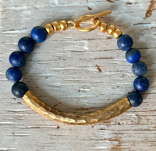 Smooth 8mm beads are combined with a hammered vermeil tube and toggle clasp to form a classy bracelet